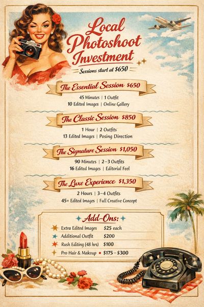 Full-Service pin-up transformations in LA/Hawaii and beyond. We provide the look, you provide the spark.